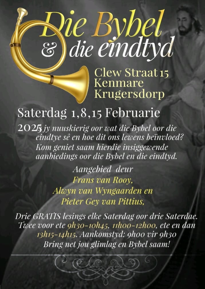 As jy nuuskierig is oor wat die Bybel oor die eindtye sê en hoe dit ons lewens beinvloed, kom gerus vir hierdie insiggewende aanbiedings oor die Bybel en die eindtyd.